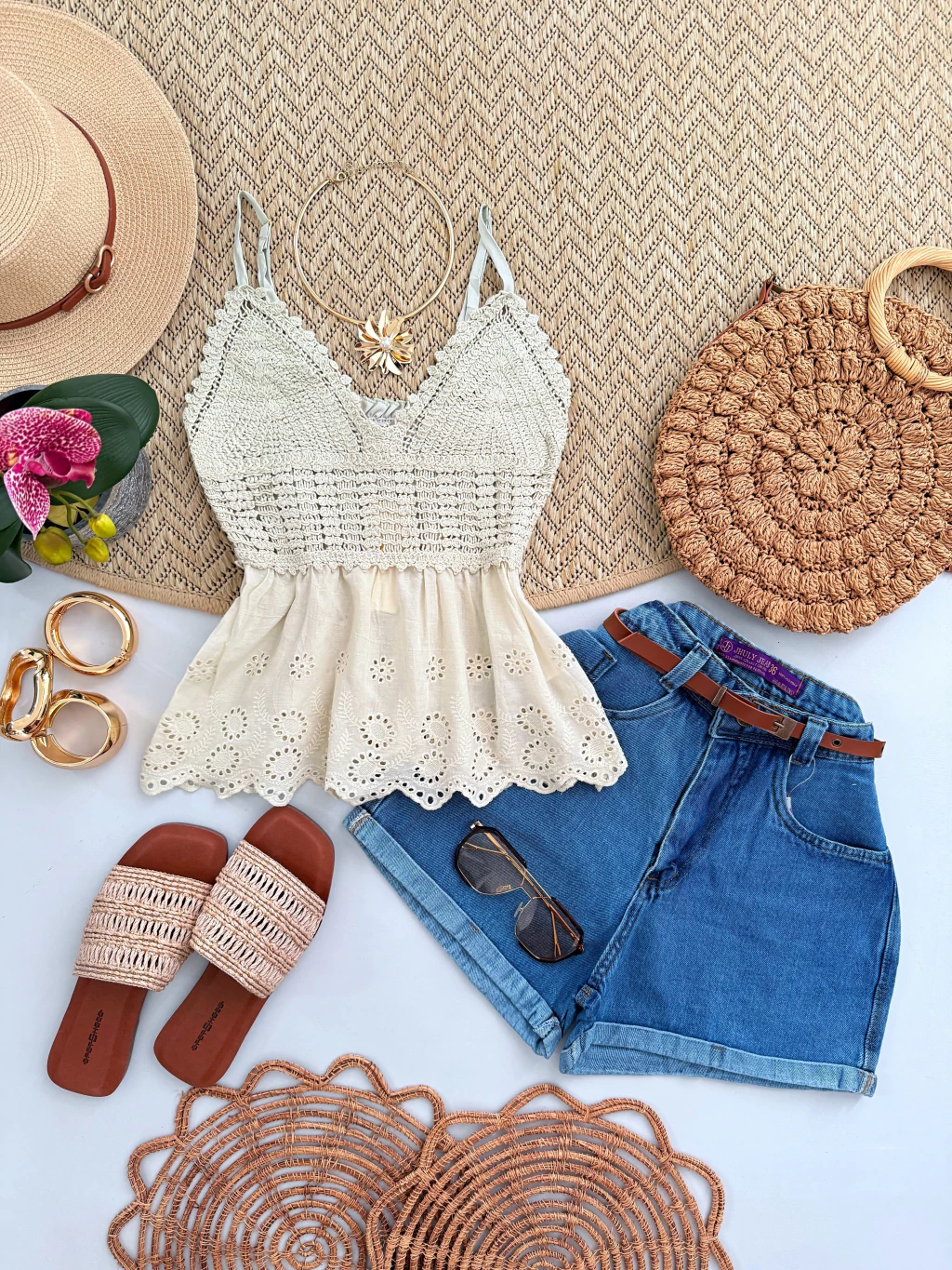 Detalhe da Blusa: Blusa tecido crochê/ lese, não possui bojo,possui alças regulável e lastex parte das costas.