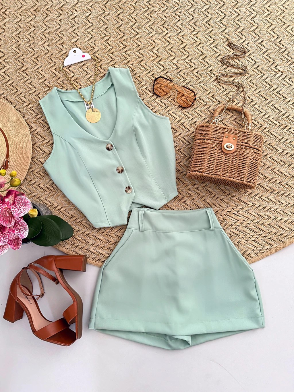 Detalhe Especial Conjunto: Conjunto de Shorts saia e colete. Colete possui botões frontais funcionais. Shorts saia possui zíper lateral, bolso frontal e passador. OBS: SHORTS PARTE DE TRÁS E SAIA PARTE DA FRENTE.