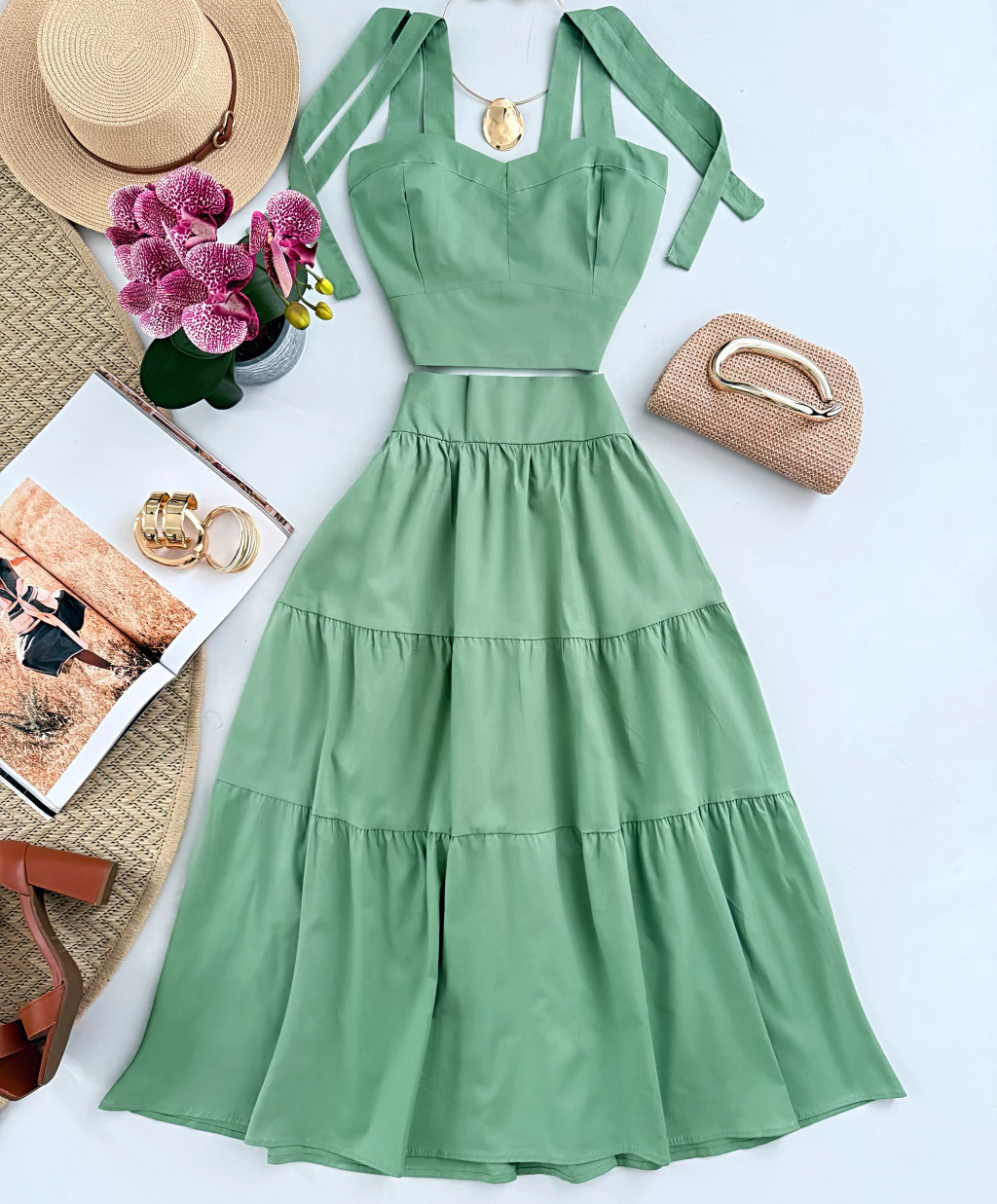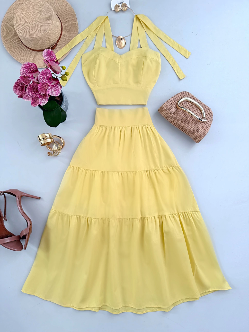 Detalhe Especial Conjunto: Conjunto Cropped e Saia Midi, tecido tricoline possui forro. Cropped não possui bojo, Alças de amarração e possui lastex parte das costas. Saia Midi, possui forro e elástico na cintura.