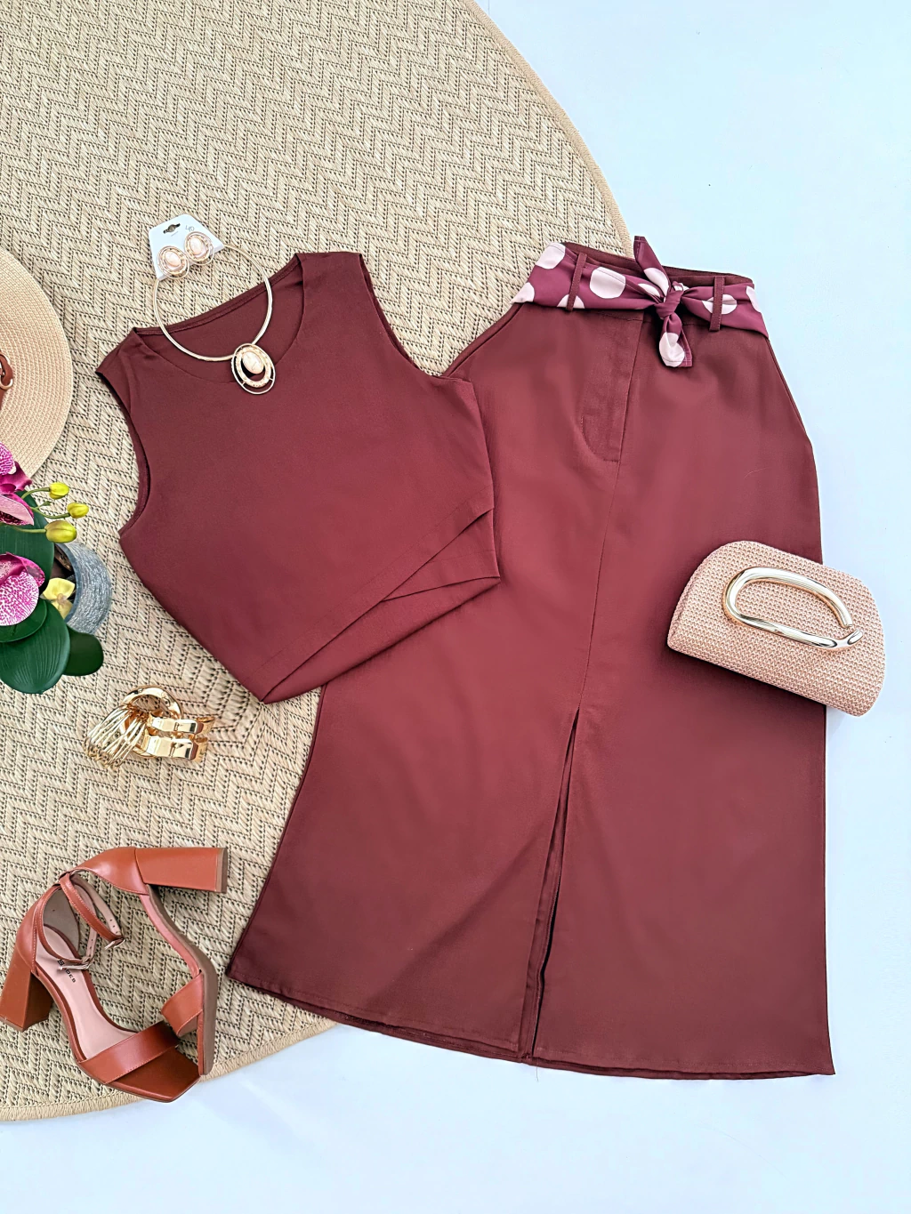 Detalhe Especial Conjunto: Conjunto com Blusa regata. Saia midi, possui botões frontal funcional, zíper e fenda frontal. Possui bolso lateral.