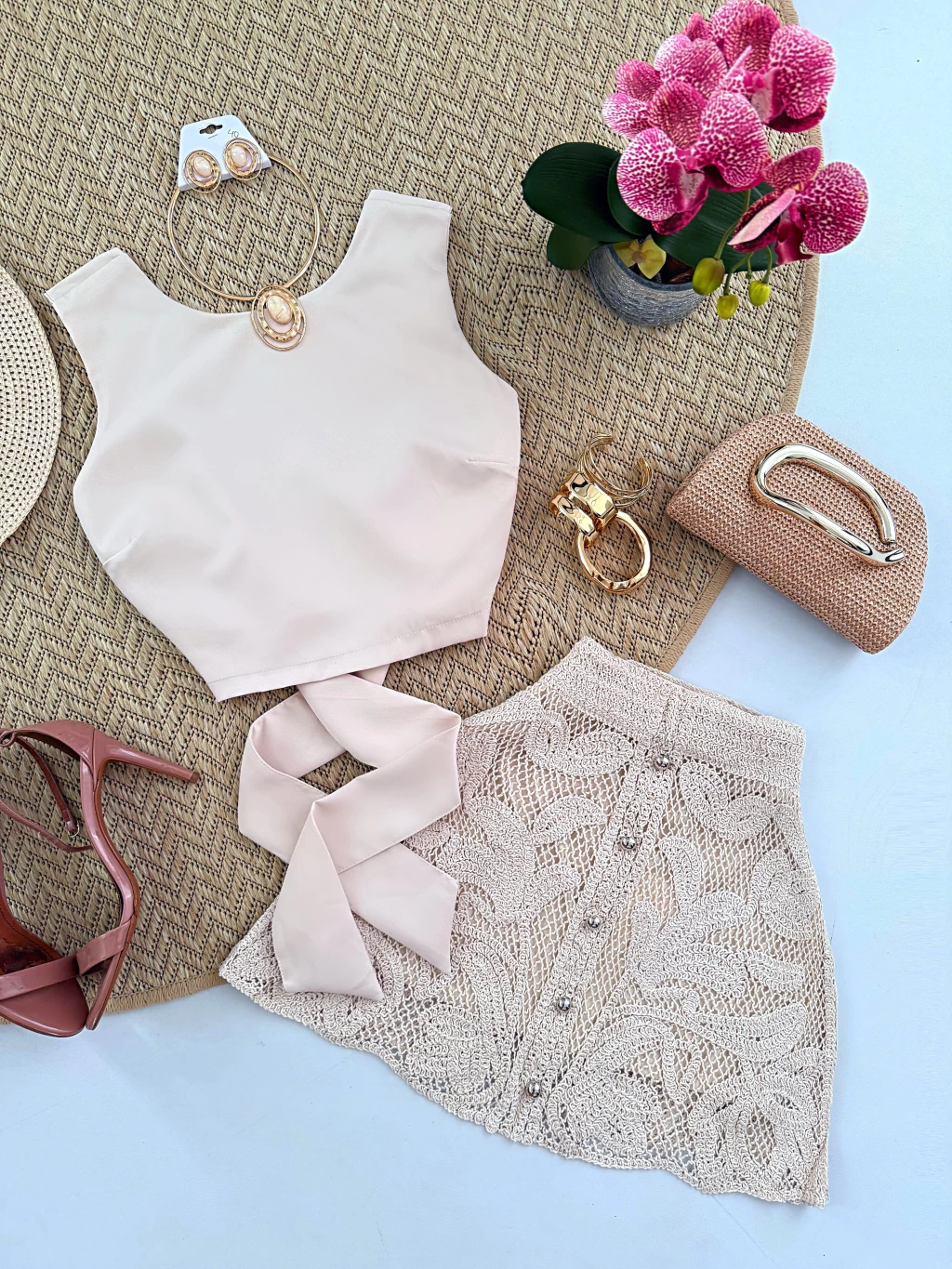 Detalhe da Saia: Saia tecido crochê, possui forro, botões frontais fake e elástico na cintura.