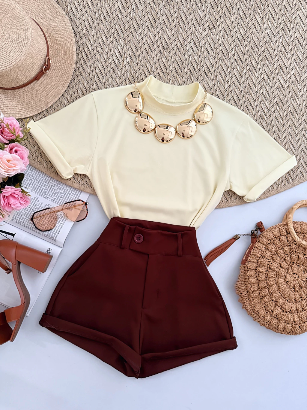 Detalhe Especial Shorts : Shorts Tecido alfaiataria, possui botão frontal funcional, zíper, passador na cintura e bolso frontal.