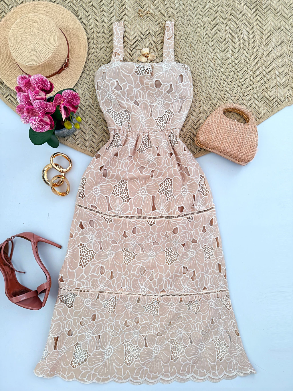 Detalhes do Vestido: Vestido Midi, tecido lese, possui bojo e lástex parte das costas.
