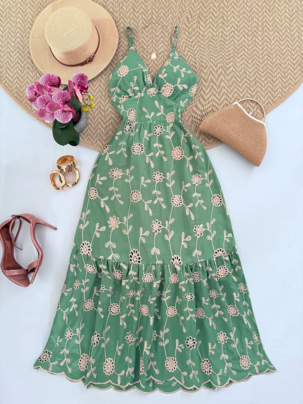 Detalhes do Vestido: Vestido Longuete ,Tecido lese bordado, possui forro, possui bojo, alças regulável e amarração parte das costas, elástico na cintura parte das costa.